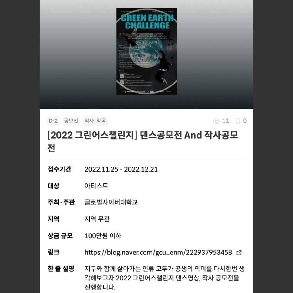 글로벌사이버대학교에서 주관한 공고입니다. 지구와 함께 살아가는 인류 모두가 공생의 의미를 다시한번 생각해보고자 2022 그린어스챌린지 댄스영상, 작사 공모전을 진행합니다.
