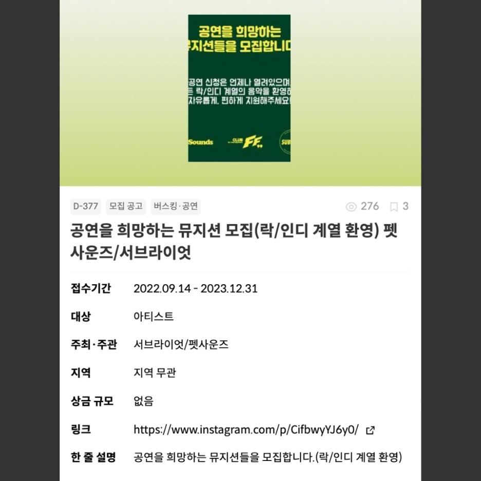서브라이엇/펫사운즈에서 주관한 공고입니다. 공연을 희망하는 뮤지션들을 모집합니다.(락/인디 계열 환영)