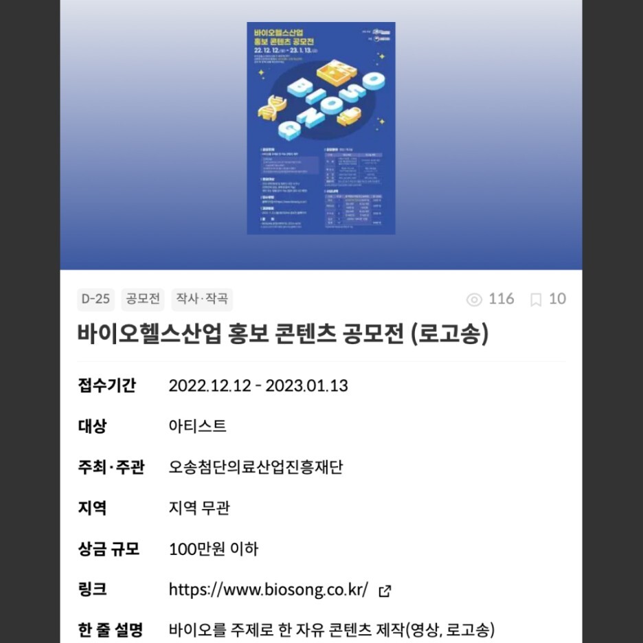 오송첨단의료산업진흥재단에서 주관한 공고입니다. 바이오를 주제로 한 자유 콘텐츠 제작(영상, 로고송)
