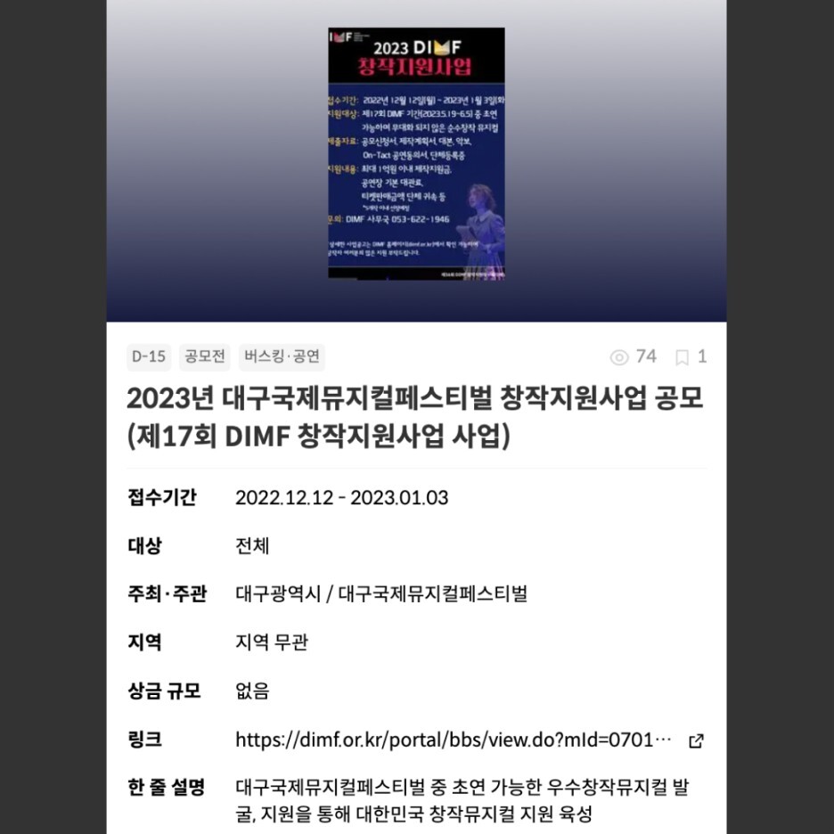 2023년 대구국제뮤지컬페스티벌 창작지원사업 공모 (제17회 DIMF 창작지원사업 사업) | 음악 정보
