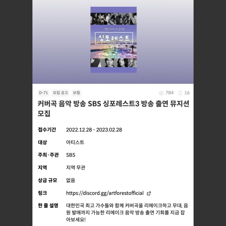 커버곡 음악 방송 SBS 싱포레스트3 방송 출연 뮤지션 모집 | 음악 정보부터 커뮤니티까지 - 버브그