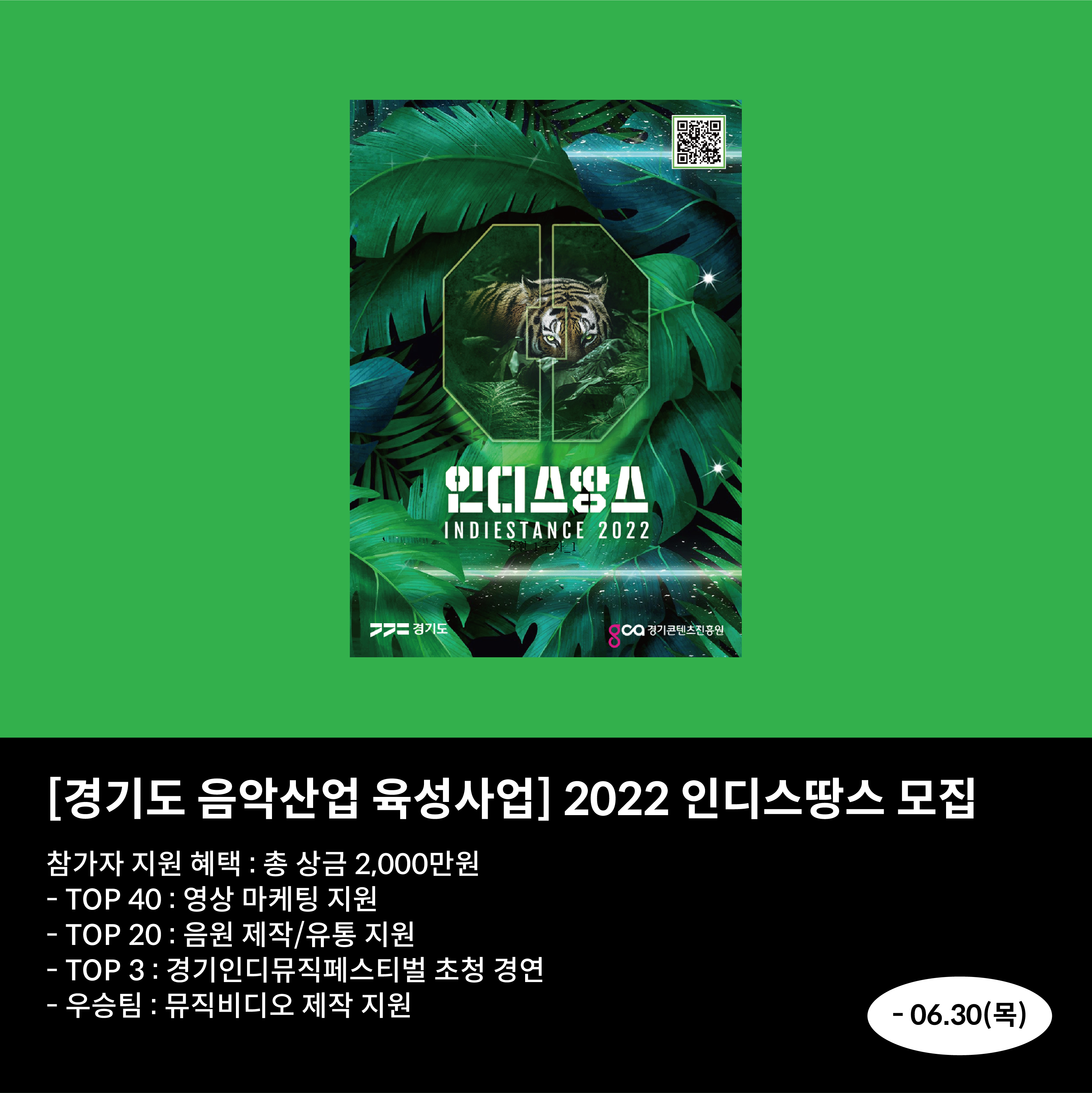 참가자 지원 혜택 : 총 상금 2,000만원 - TOP 40 : 영상 마케팅 지원 - TOP 20 : 음원 제작/유통 지원 - TOP 3 : 경기인디뮤직페스티벌 초청 경연 - 우승팀 : 뮤직비디오 제작 지원