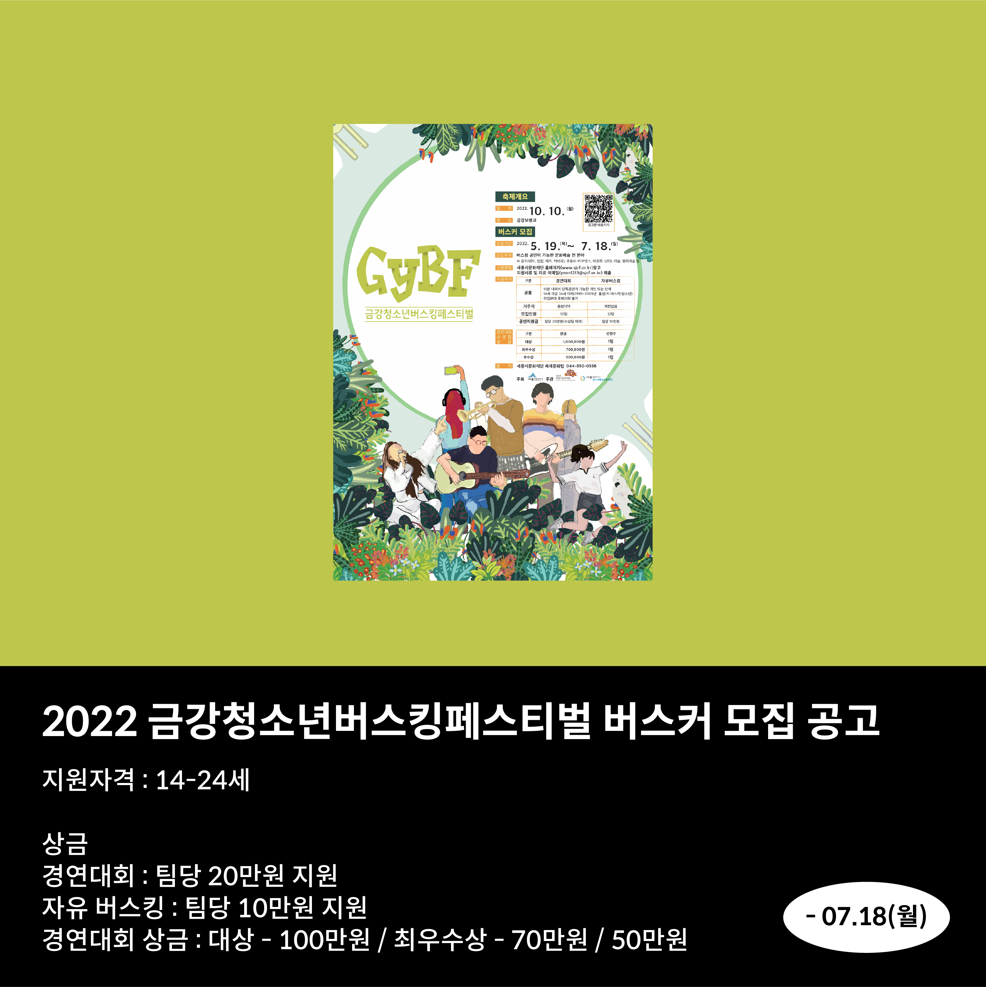 경연대회 : 팀당 20만원 지원 자유 버스킹 : 팀당 10만원 지원 경연대회 상금 : 대상 - 100만원 / 최우수상 - 70만원 / 50만원
